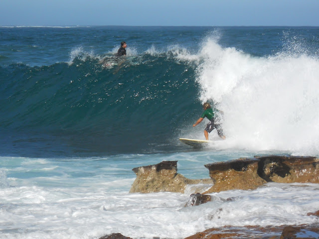 Okay, maybe by Australian standards it was a medium sized day but 7+ ft on the face is plenty big compared to the average waist to chest high wave I surfed in FL. Felt good to paddle into some bombs and come out alive. I've been surfing a 6'3" CI Flyer or 6'6" Warner since I've been here and today was the first day I was glad I had more board under my feet. Of course I took a few on the head but that was to be expected. Can't wait to get my own board(s) so I can mount the GoPro on it and get some good footage of me barely surviving the curtain drops (closeout wave that breaks on top of you for all you non-surfers). The below pics aren't of where I surfed this morning (surfed on the north end of Dee Why, called Long Reef, so I could get some lefts) but here's what Dee Why point looked like in the afternoon. Too tired to paddle out again so I'll just live vicariously through these guys.